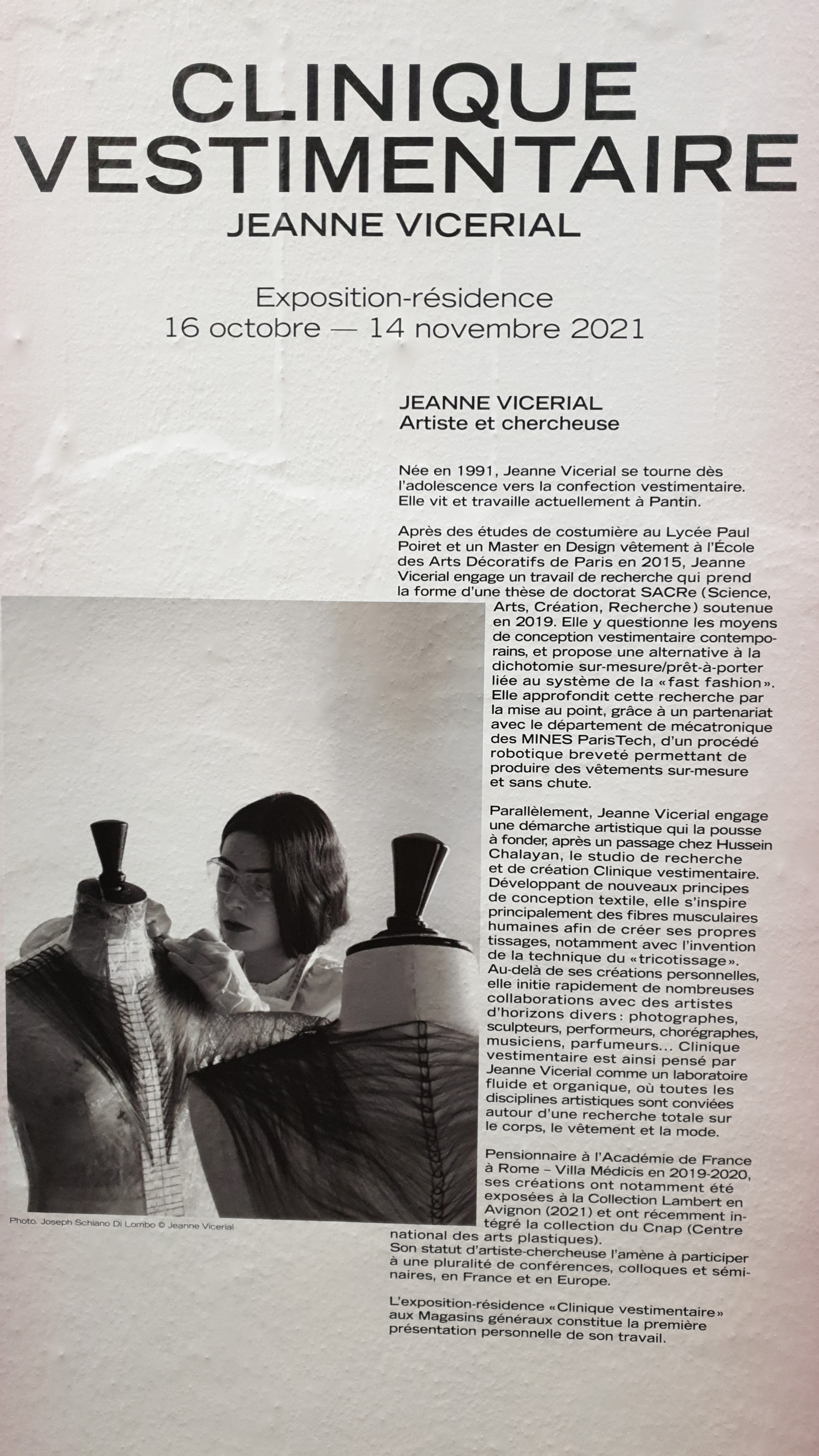 La dernière exposition vue : celle de Jeanne VICERIAL CLINIQUE VESTIMENTAIRE. Des œuvres précises, précieuses, qui parlent à l âme, du corps et de ses parures. Les couleurs sont belles, féminines et puissantes. Les magasins généraux réservent toujours de belles surprises dans un quartier de PANTIN en pleine essor. Merci.
